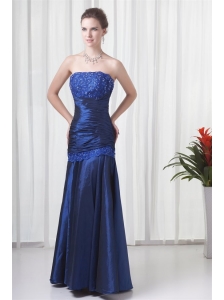 Column Strapless Navy Blue Ruching Prom Dress with Lace Up