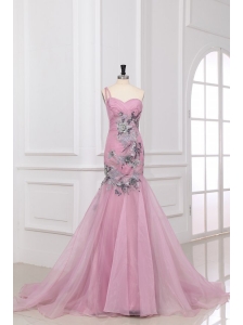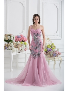 Mermaid One Shoulder Appliques Organza Court Train Pink Prom Dress