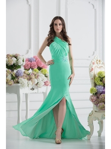 Apple Green Column One Shoulder Prom Dress with Ruching and Beading
