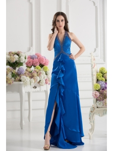 Column Blue Empire Halter Top Prom Dress with Beading and High Slit