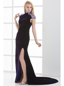 Column High-neck Cap Sleeves Dark Purple Beading High Slit Prom Dress