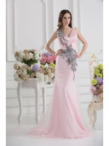 Column Straps Lace Appliques Ruching Baby Pink Lace Prom Dress