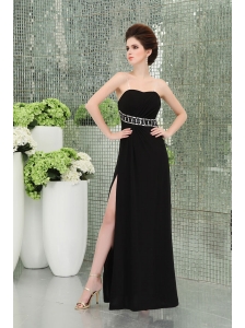 Strapless Empire Black Chiffon Belt Prom Dress with High Slit Ruchings