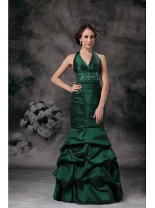 Exquisite Dark Green Mermaid Halter Evening Dress Taffeta Beading Floor-length