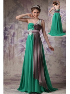 Cheap Green Empire One Shoulder Evening Dress Chiffon Appliques Brush Train