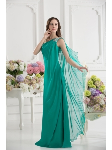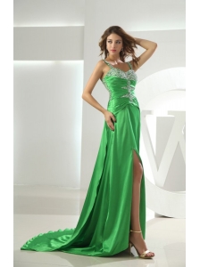 Green Empire One Shoulder Beading Watteau Train Ruching Prom Dress