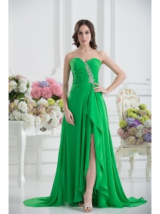 Column Sweetheart Beading Ruching Green High Slit Prom Dress
