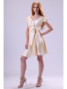Light Yellow V-neck Cap Sleeves Bow Ruching Prom Dress