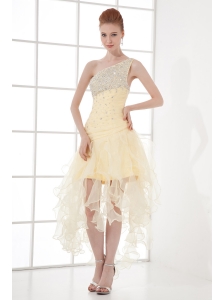 A-line One Shoulder High-low Ruchings Beading Organza Light Yellow Prom Dress
