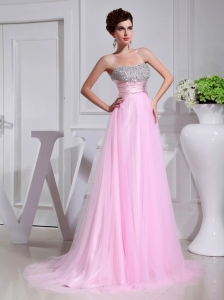 A-line Brush Train Beading Tulle Strapless Baby Pink Prom Dress