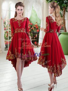 Dramatic High Low Wine Red Prom Party Dress Satin Long Sleeves Embroidery