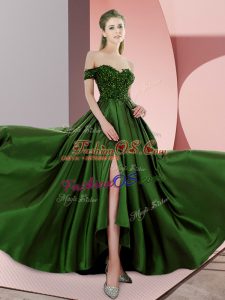 Beading Prom Evening Gown Apple Green Zipper Half Sleeves Tea Length