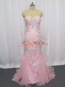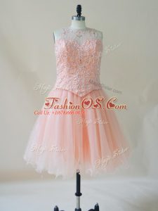 Mini Length Rose Pink Prom Gown Tulle Sleeveless Beading