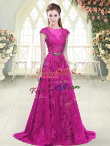 Customized Fuchsia Zipper Lace and Appliques Cap Sleeves Sweep Train