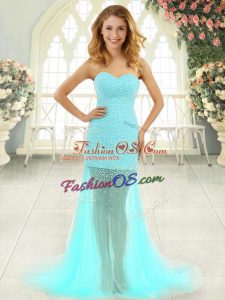 Aqua Blue Column/Sheath Beading Homecoming Dress Zipper Tulle Sleeveless