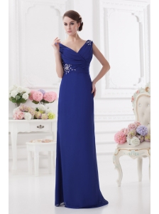 Luxurious Mermaid V-neck Navy Blue Beading Brush Train Prom Dress