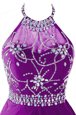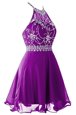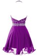 Purple A-line Halter Top Sleeveless Organza Mini Length Zipper Beading Dress for Prom