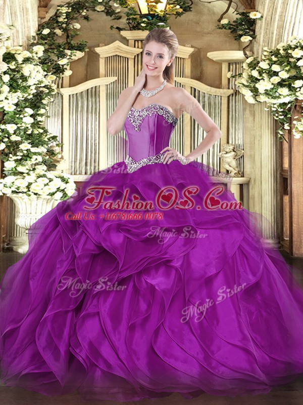 Purple Ball Gowns Organza Sweetheart Sleeveless Beading and Ruffles Floor Length Lace Up Sweet 16 Dresses