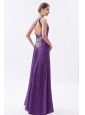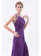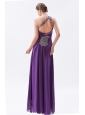 Purple chiffon prom dress feathers the fabulous status. Backless and side splitting accent your sexy feeling. One-shoulder design is great and attractive.Beadings and sequins features the one shoulder and the back.This excellent dress is your best choice for any party.