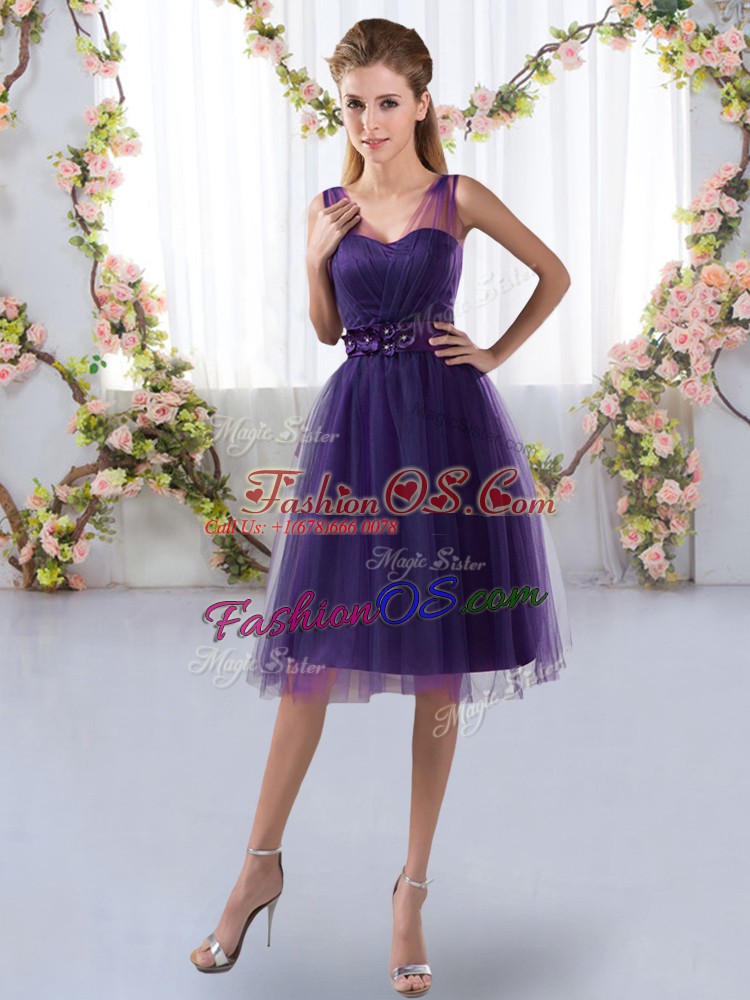 Purple Empire Tulle V-neck Sleeveless Appliques Knee Length Zipper Bridesmaid Dresses