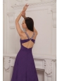 Full of vitality gown! This flawless halter-top purple dress is adorned with colorful beading in the middle bodice and the straps.All pleated up part change the whole dress into cheery!The open back and the little chapel train make you be the sexiest woman alive!Whole purple dress bring aura of mystery.