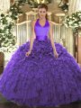 Purple Organza Lace Up Halter Top Sleeveless Floor Length Quinceanera Dresses Ruffles
