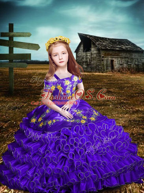 Purple Organza Lace Up Off The Shoulder Short Sleeves Floor Length Little Girls Pageant Dress Wholesale Embroidery and Ruffled Layers