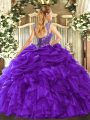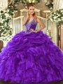 Purple Organza Lace Up Straps Sleeveless Floor Length Sweet 16 Dresses Beading and Ruffles and Pick Ups