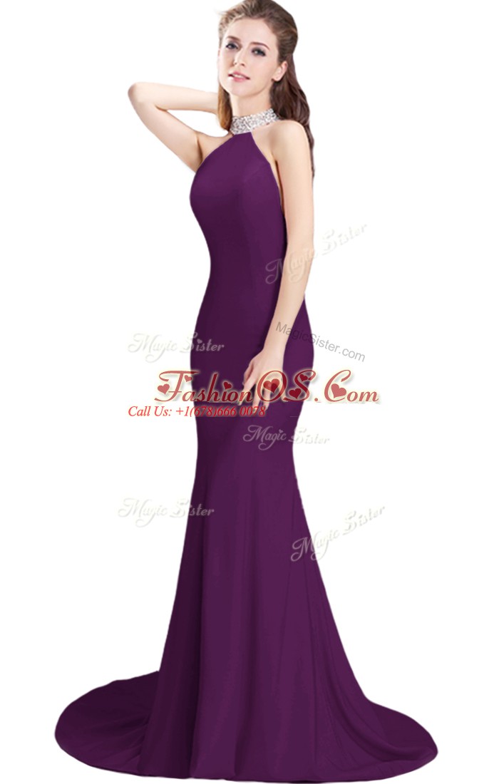 Purple Side Zipper Prom Dresses Beading Sleeveless Brush Train