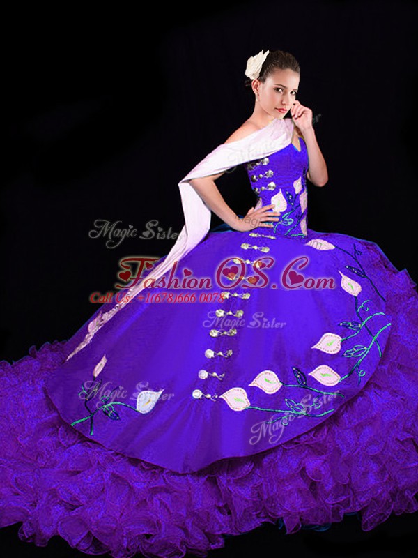 Purple Sleeveless Embroidery and Ruffles Lace Up Vestidos de Quinceanera