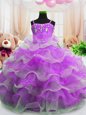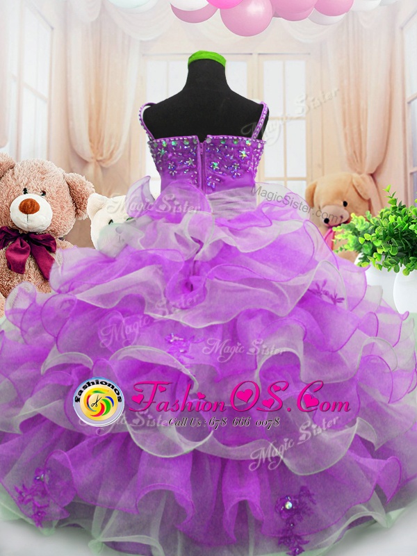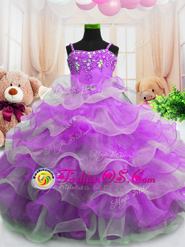 Purple Spaghetti Straps Zipper Beading and Ruffled Layers Girls Pageant Dresses Sleeveless