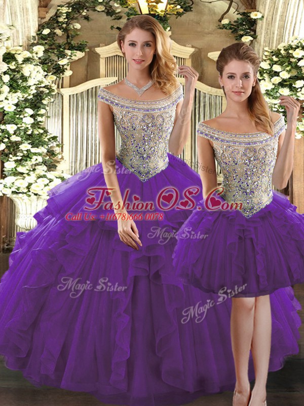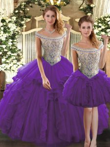 Purple Three Pieces Beading and Ruffles Quinceanera Gown Lace Up Organza Sleeveless Floor Length