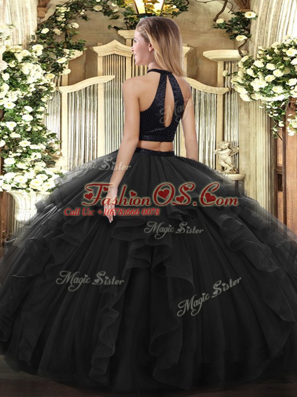 Purple Tulle Backless Ball Gown Prom Dress Sleeveless Floor Length Beading and Ruffles
