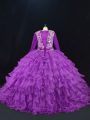 Purple V-neck Lace Up Beading and Ruffled Layers Sweet 16 Dresses Long Sleeves