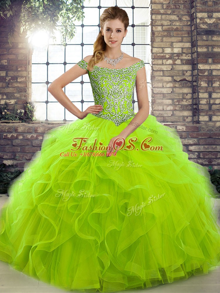 Home >  Quinceanera Dresses >  Fast Delivery Quinceanera Dresses > Quince Ball Gowns Off The Shoulder Sleeveless Brush Train Lace Up