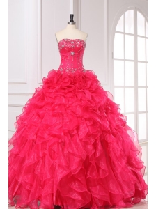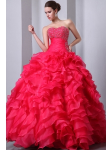 Beading and Ruffles Strapless Organza Quinceanera Dress in Coral Red