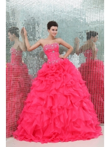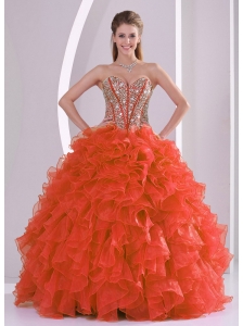 Ball Gown Sweetheart Ruffles and Beaded Decorate Coral Red Sweet 16 Dresses