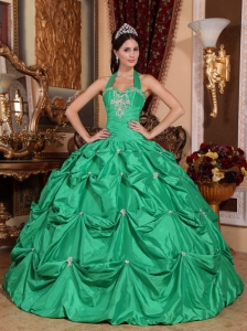 Exclusive Apple Green Quinceanera Dress Halter Top Taffeta Appliques Ball Gown