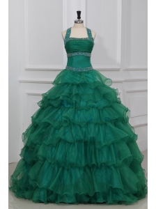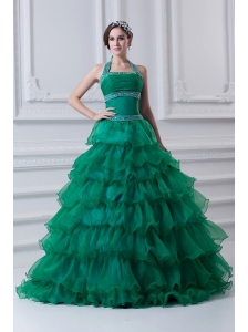 Green Halter Top Beading and Ruffles Layered Quinceanera Dress