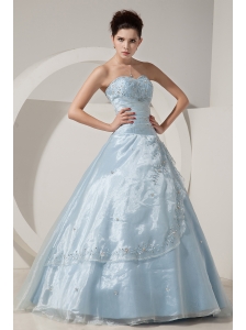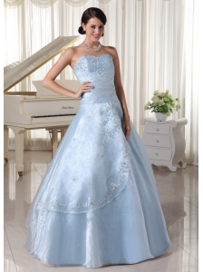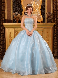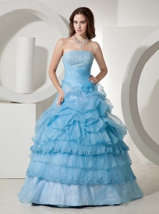 Romantic Baby Blue Quinceanera Dress Strapless Organza Beading Ball Gown