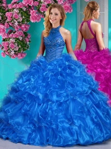 Beautiful Halter Top Beaded and Ruffled Quinceanera Dress in Royal Blue