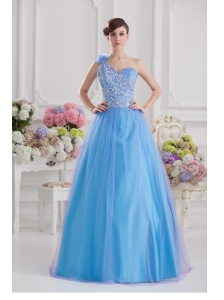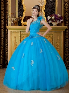 Low Price Quinceanera Dress Teal One Shoulder Tulle Appliques Ball Gown