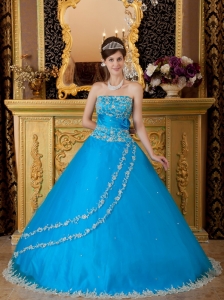 Teal Ball Gown Strapless Floor-length Tulle Lace Appliques Quinceanera Dress