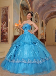 Formal Baby Blue Quinceanera Dress Strapless Bows Sequins and Organza Ball Gown