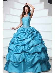 Beading and Pick-ups One Shoulder Teal Taffeta Quinceanera Dress
