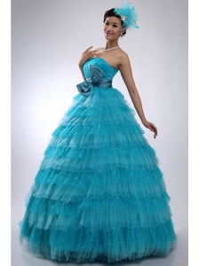 Teal Strapless Tulle and Sequins Long Quinceanera Dress with Bowknot