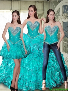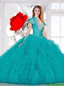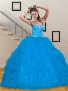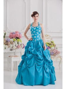 Princess Taffeta Appliques Ruffles Teal Quinceanera Dress with Halter Top
