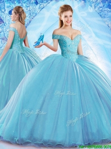 2017 Cheap Beaded Off the Shoulder Teal Quinceanera Dress in Tulle