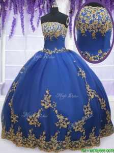 Low Price Strapless Zipper Up Blue Quinceanera Gown with Gold Appliques