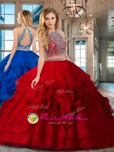 2017 Brush Train Red and White Quinceanera Dress with Beading and Ruffled Layers